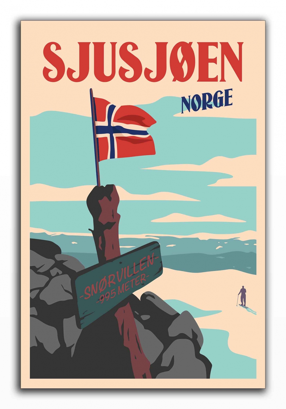 En stilren retroplakat fra Sjusjøen, med Snørvillen 995 moh, inspirert av klassiske reisepostere og laget for deg som elsker fjellet, hyttelivet og norsk natur.