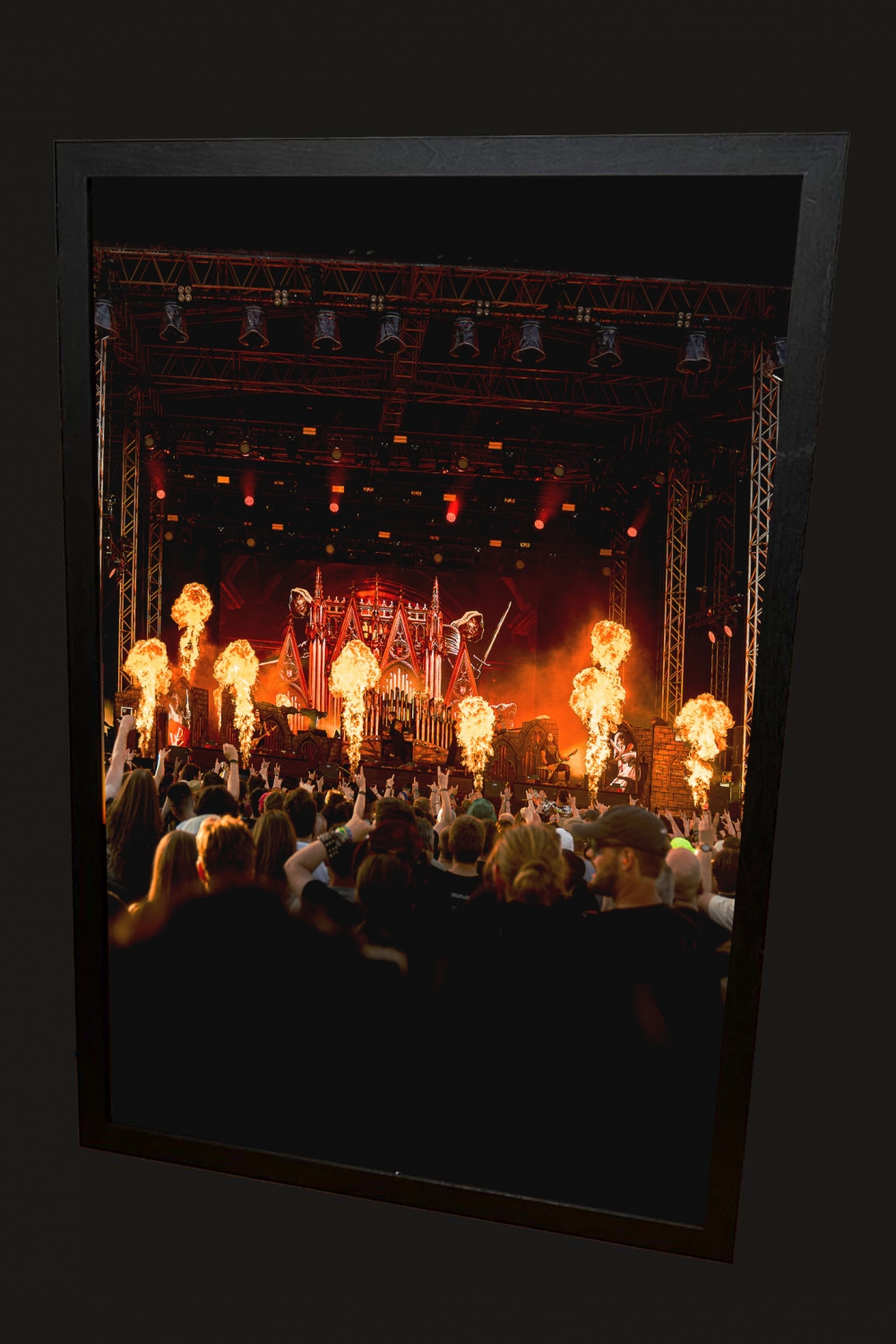 Et øyeblikk av maksimal intensitet – flammer, publikum og total tilstedeværelse, montert som et unikt kunstobjekt i original vintage-ramme. Fotografert og produsert av Simen Roberg.