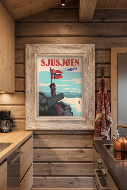 Dette er en plakat som passer spesielt godt for hyttefolk fjellentusiaster skiløpere og alle som har et forhold til Sjusjøen enten som feriested barndomsminne eller et sted man stadig vender tilbake til. Den fungerer like fint alene som en tydelig statement på veggen som i kombinasjon med andre fjell og hyttemotiver for å skape en helhetlig vegg.