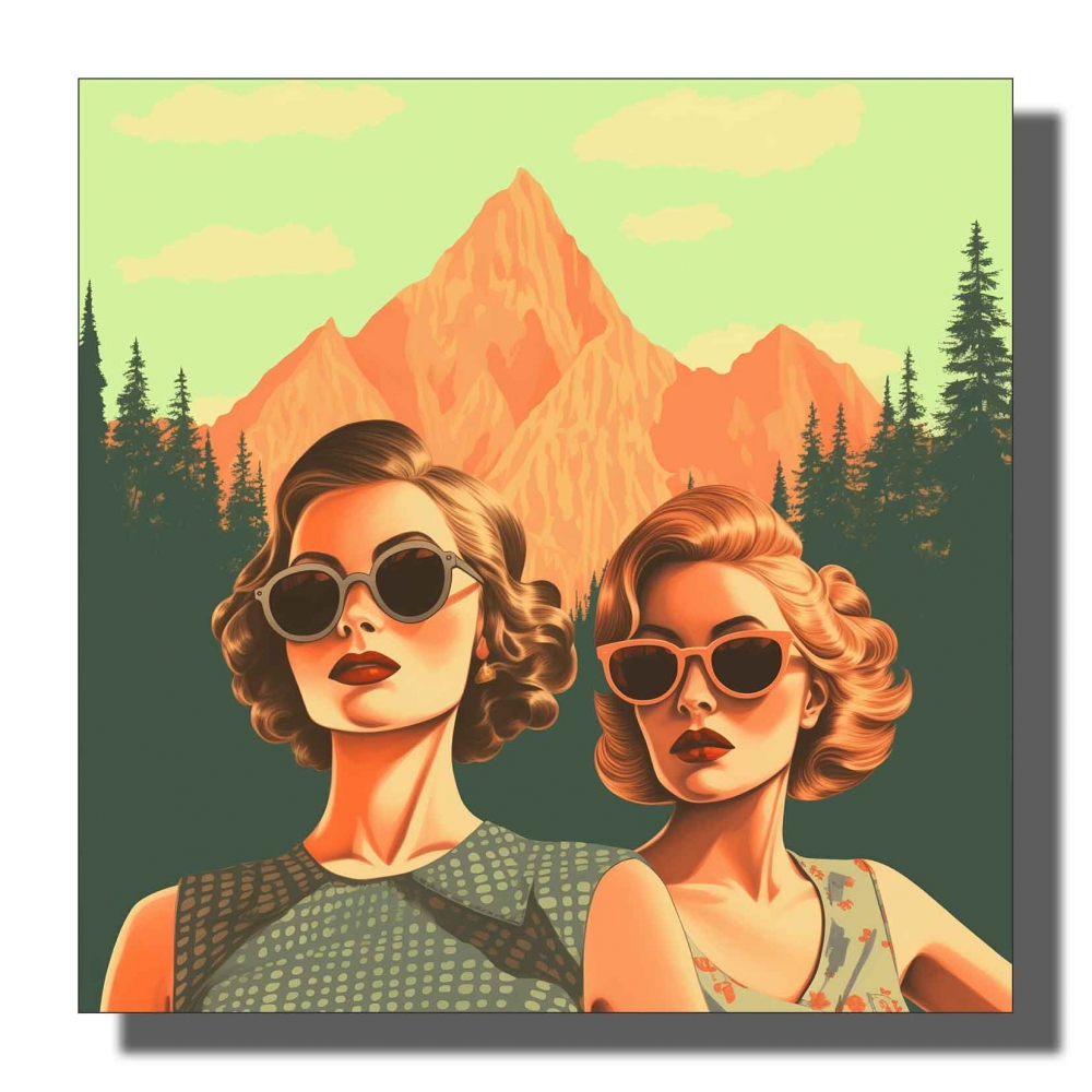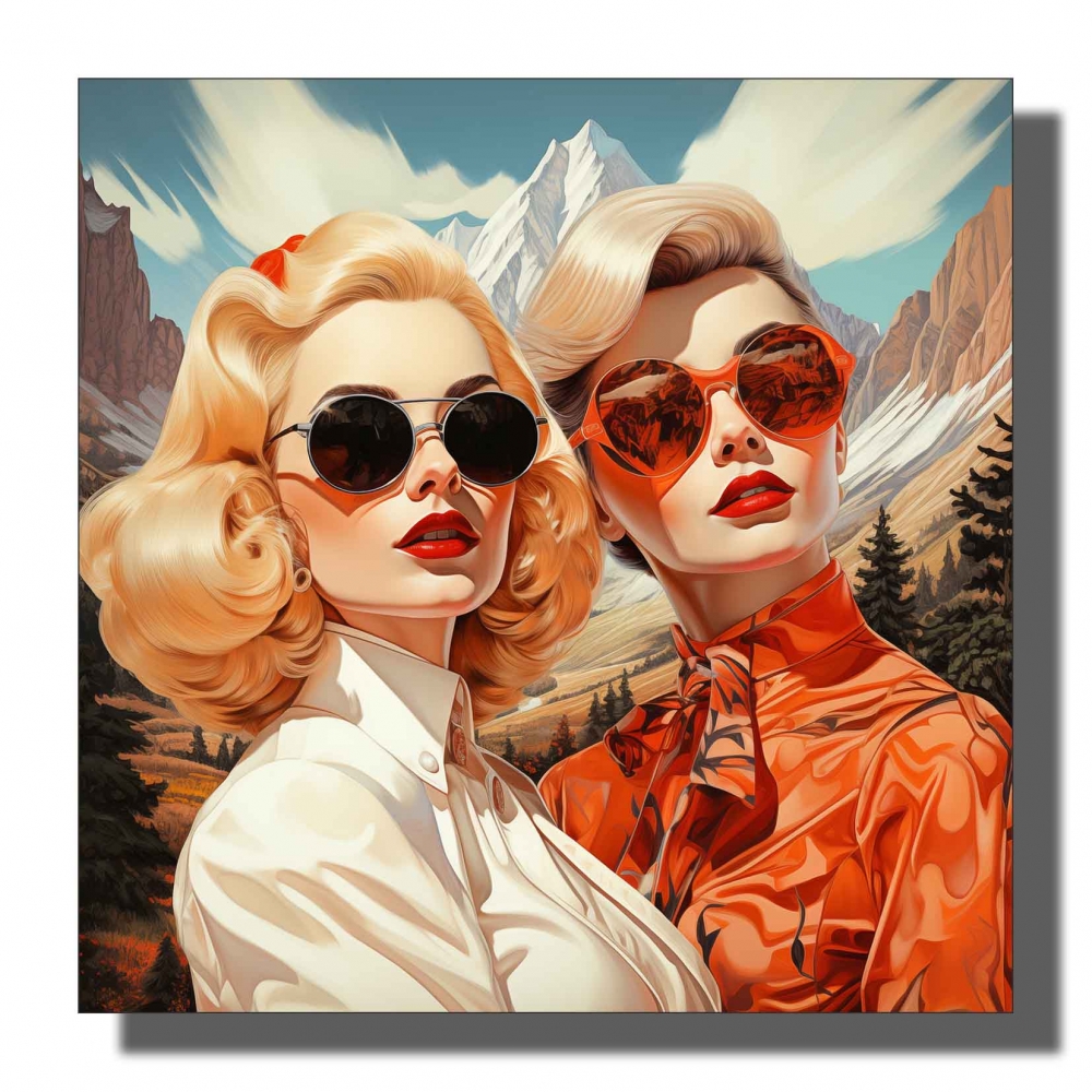 Kvadrat , 80s inspirert , to damer foran fjell , v.dame skjorte og slips høy metning og kontrast , digital tegning