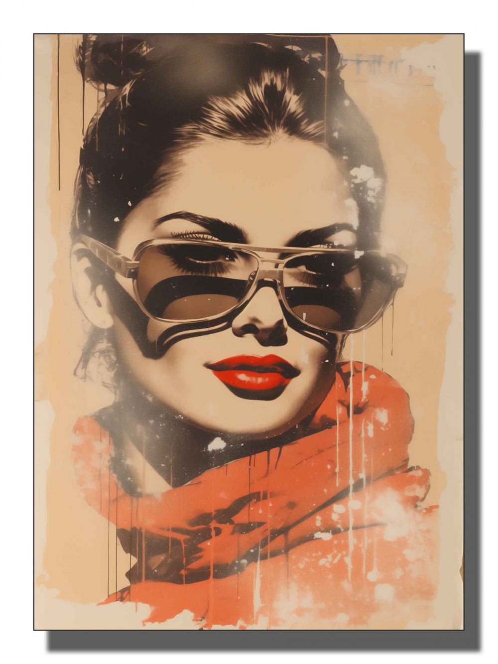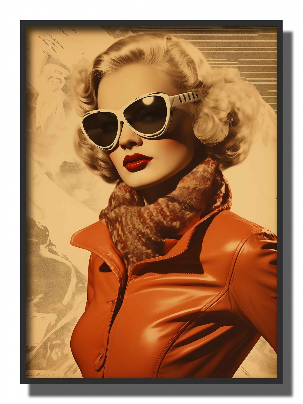 klassisk kvinne , retro slalombriller , vinrød genser , røde lepper , blond , oransje og beige bakgrunn