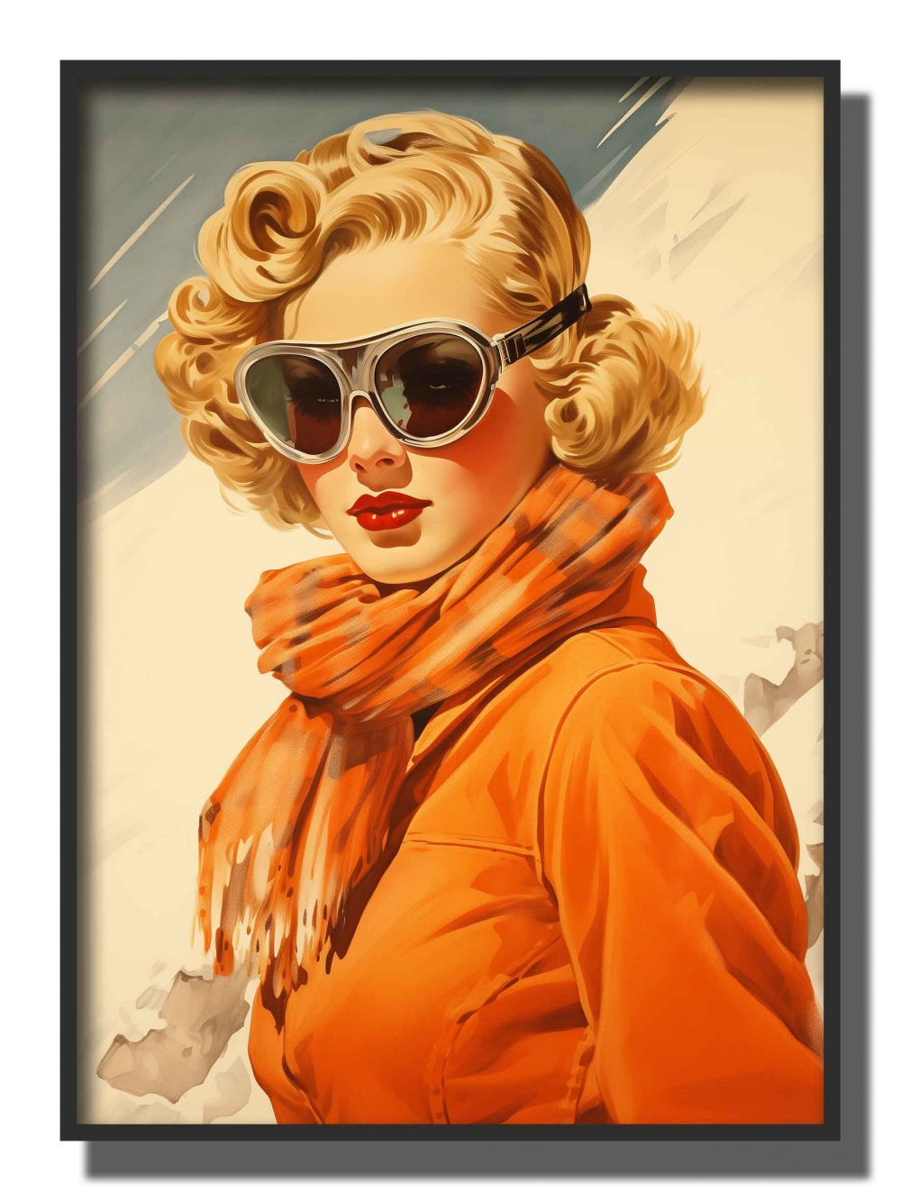RETRO DAME , BLONDT HÅR , ORANSJE HØYHALSET GENSER , FORAN SKIBAKKEN