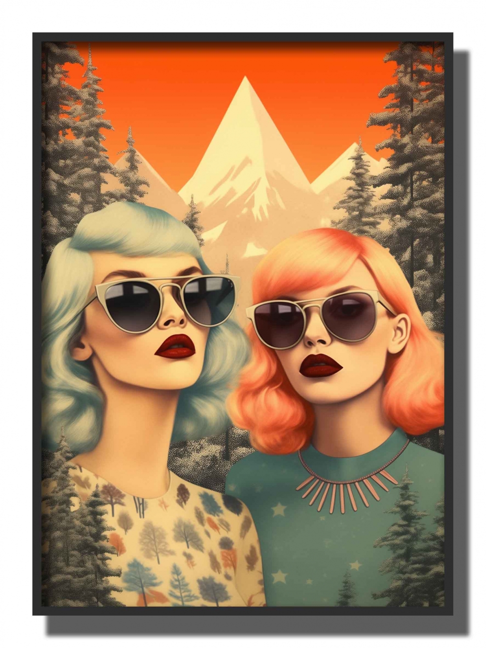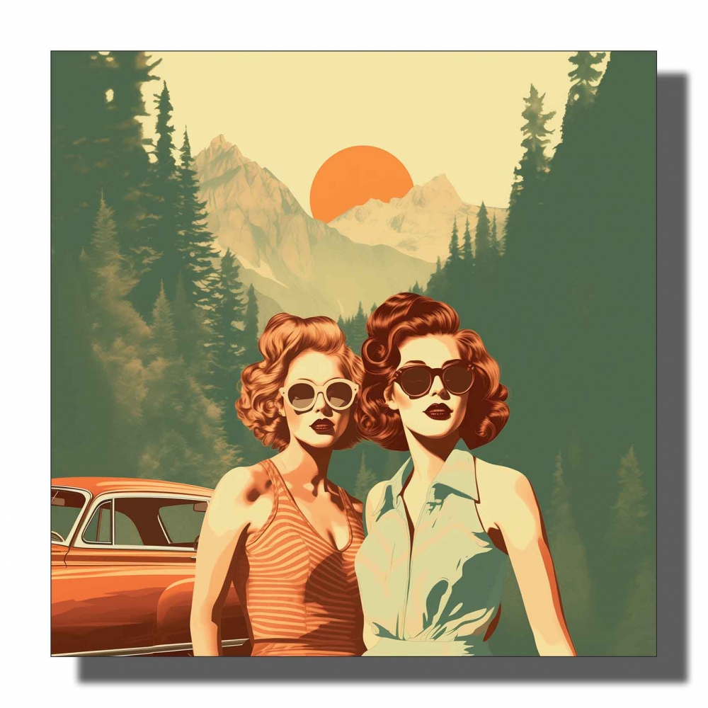 kvadratisk to retro damer foran fjell og skog , blågrønt og grønt hår med oransje topp og bøyle