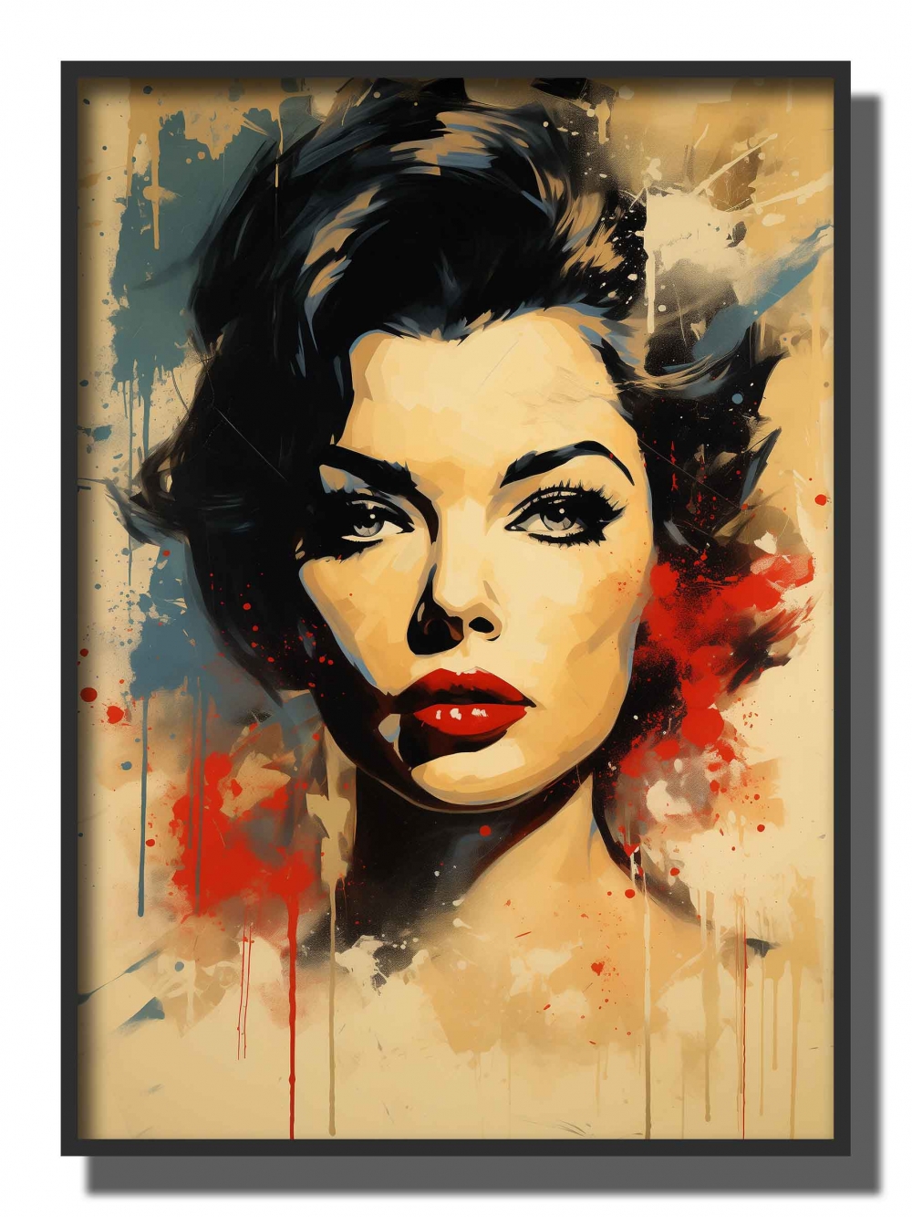 PORTRETT AV DAME, RETRO , SORT HÅR , RØDE LEPPER