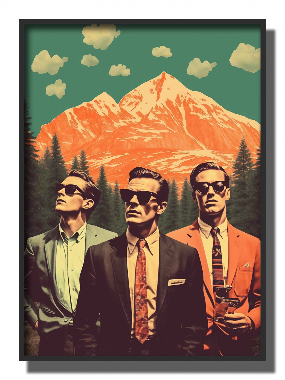 retro , tre menn under oransje himmel , teal jakke i front