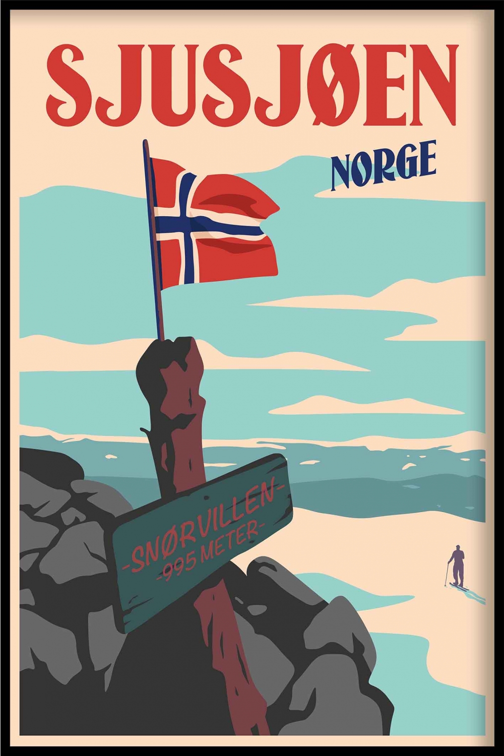 En stilren retroplakat fra Sjusjøen, med Snørvillen 995 moh, inspirert av klassiske reisepostere og laget for deg som elsker fjellet, hyttelivet og norsk natur.