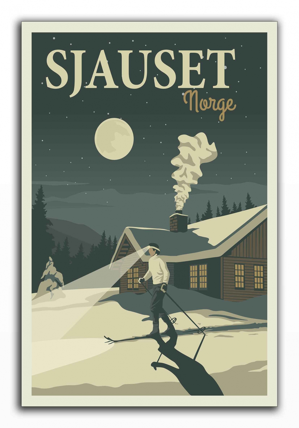 En stemningsfull retroplakat fra Sjauset i Norge inspirert av klassiske reisepostere og laget for deg som setter pris på vinterro hytteliv og norsk fjellnatur.