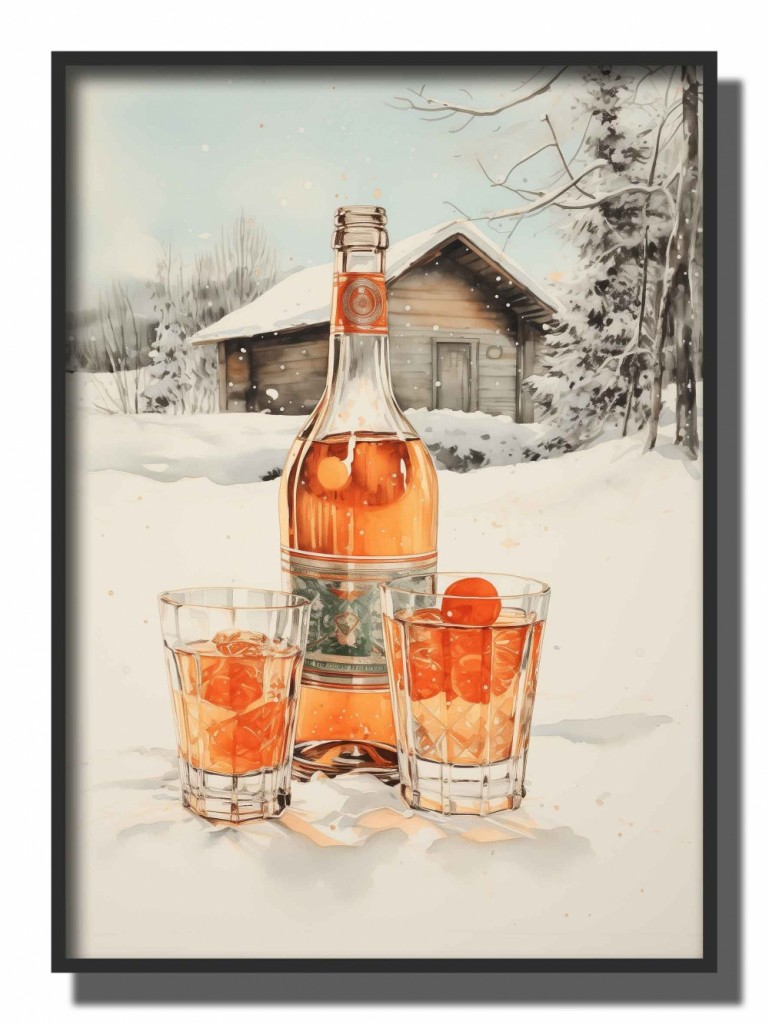 Flaske og to glass med god drikke foran hytta , oransje drikke , maleriposter
