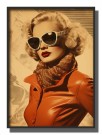 Retro dame i brun skinnjakke , blond , hvite briller , skjerf i halsen