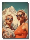 Sommerkledde damer foran vinterdekt fjell , oransje singlet , blondt hår , blågrønn himmel
