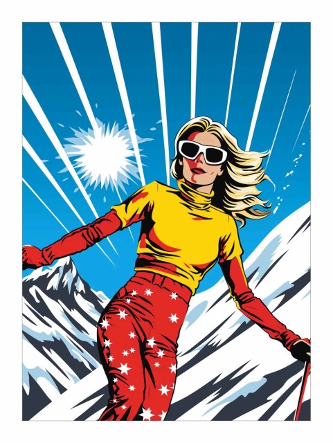 pop art , dame på ski , rød bukser med stjerner , gul topp