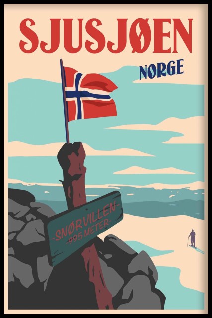 Dette er en plakat som passer spesielt godt for hyttefolk fjellentusiaster skiløpere og alle som har et forhold til Sjusjøen enten som feriested barndomsminne eller et sted man stadig vender tilbake til. Den fungerer like fint alene som en tydelig statement på veggen som i kombinasjon med andre fjell og hyttemotiver for å skape en helhetlig vegg.