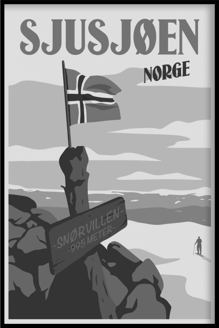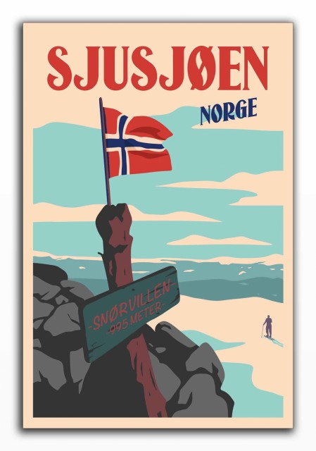Denne plakaten er inspirert av Sjusjøen og Snørvillen et sted mange forbinder med vidde stillhet skiglede og den helt særegne roen som bare fjellet gir. Uttrykket henter tydelige referanser fra klassiske nordiske reisepostere med dempede farger og et tidløst formspråk som passer like godt på hytta som hjemme i stua.