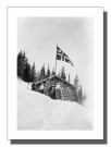 Et nostalgisk tilbakeblikk på en ekte norsk vinter! Dette stemningsfulle fotografiet fanger et øyeblikk av glede og fellesskap utenfor en laftet fjellhytte, med det norske flagget vaiende i vinden. Med ski lent mot veggen og snøen som glitrer i lyset, vekkes minner om lange skiturer, varme i hytta og den rene, friske fjelluften. Et vakkert motiv for alle som elsker norsk natur og tradisjonelt hytteliv!